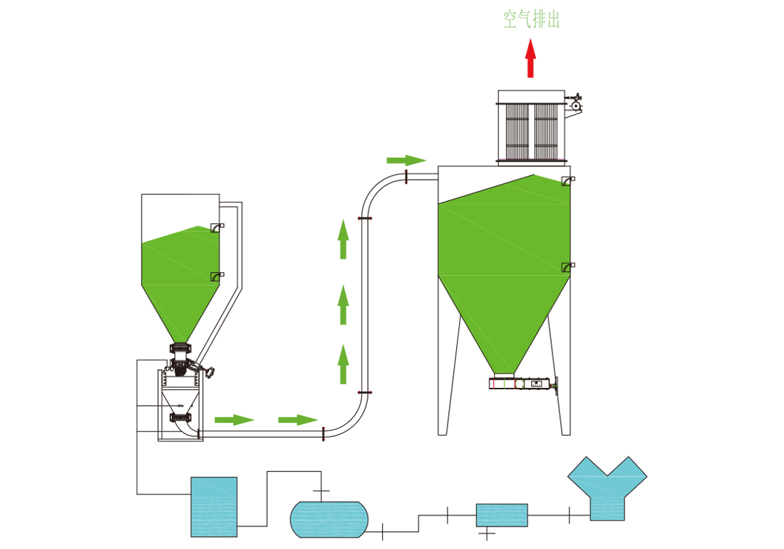 該輸送方式對難以輸送的粉粒料可實現定量穩定輸送,也可對存在背壓的管路作連續供料輸送其構造堅固,內部設有流化裝置,還可作高效、長距離輸送。